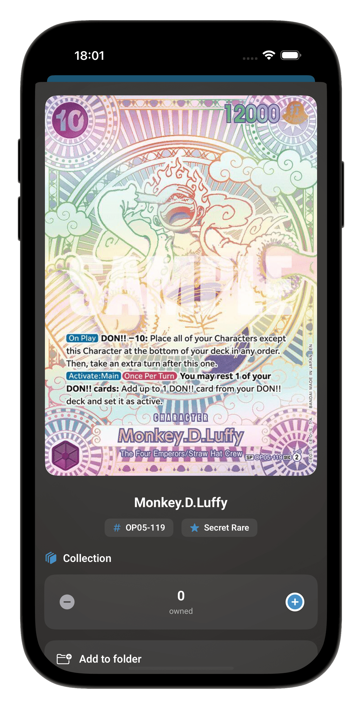 This app is quite perfect for my needs! I love it and I hope you keep updating it with OP11, more Dons and Promos. I collect Japanese and many things can't be added yet. Have you considered a one time pay for just a couple functions? i would buy it right away!
