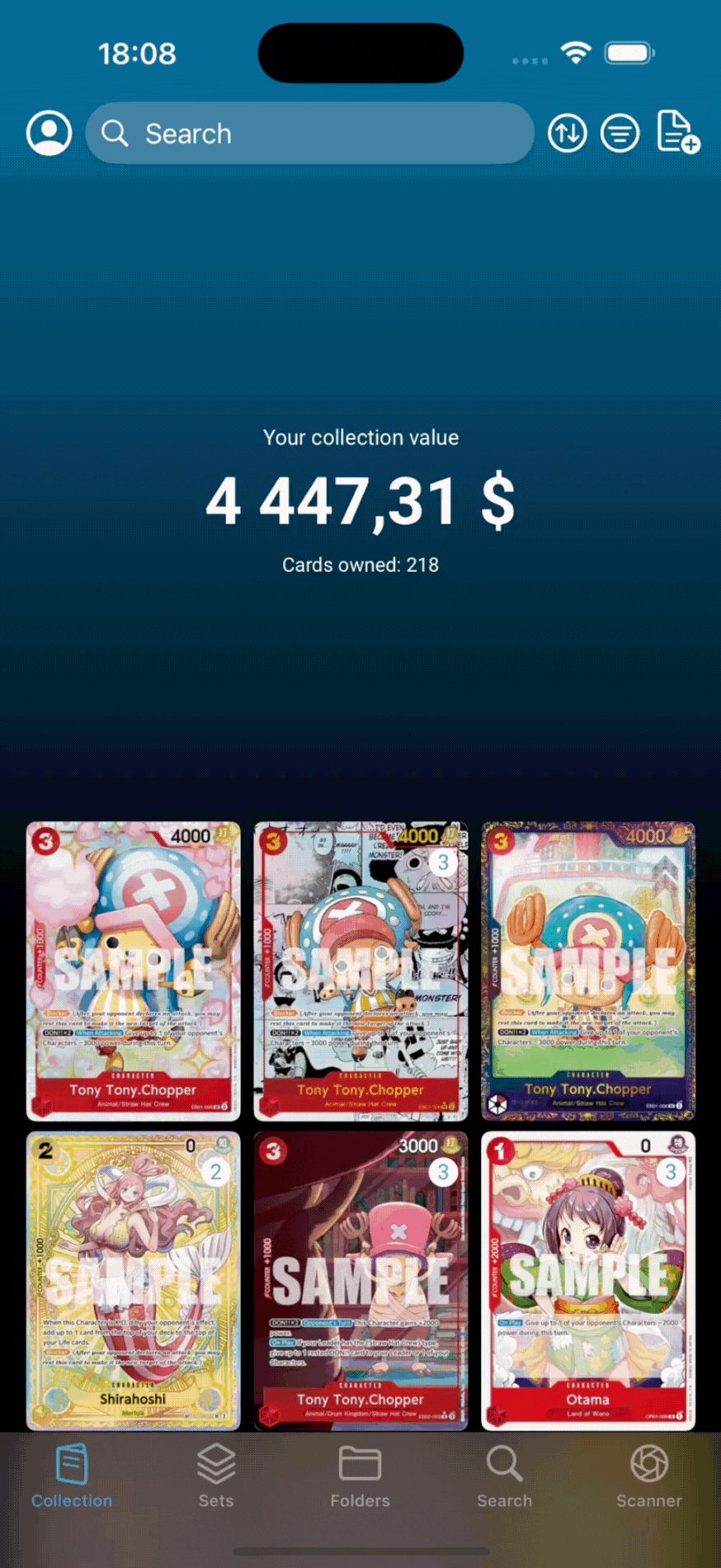 Logia is the ultimate companion for One Piece Card Game Collectors and Players. Instantly scan cards, track your collection, build decks, track deck stats, discover new additions, check current values, and explore powerful tools to manage your growing library.